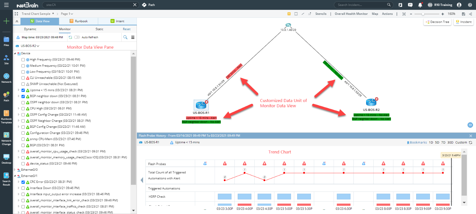•Monitoring Data View – A special Data View demonstrating the results of Flash Probe and the Monitoring Variable defined in the Adaptive Monitor. You can customize the visual appearance of these results for each device in the dynamic map.