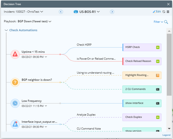 Decision tree provides troubleshooting knowledge and results based on a single device. The results are organized by playbook and types of troubleshooting knowledges.