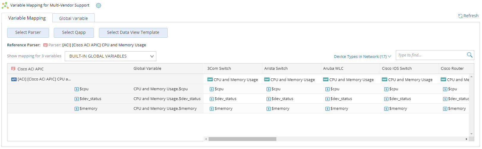 The view of variable mappings can be toggled between built-in global variables and customized global variables. Built-in variables are predefined and maintained by NetBrain team, and can be saved as customized variables.