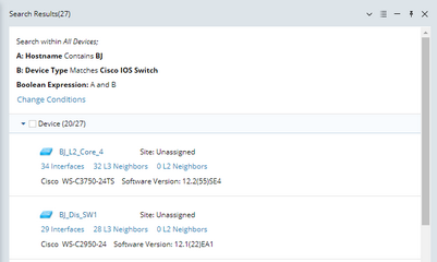 ▪Device Property — use one or more device properties to find devices. ▪Interface Property — use one or more interface properties to find devices. ▪Module Property — use one or more module properties to find devices. ▪Config File — use texts in the configuration file to find devices. ▪Front Server — use a Front Server to find their managed devices. |