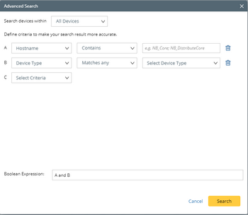 Advanced search allows you to build complex search queries to search for devices by using multiple search criteria and a boolean expression.