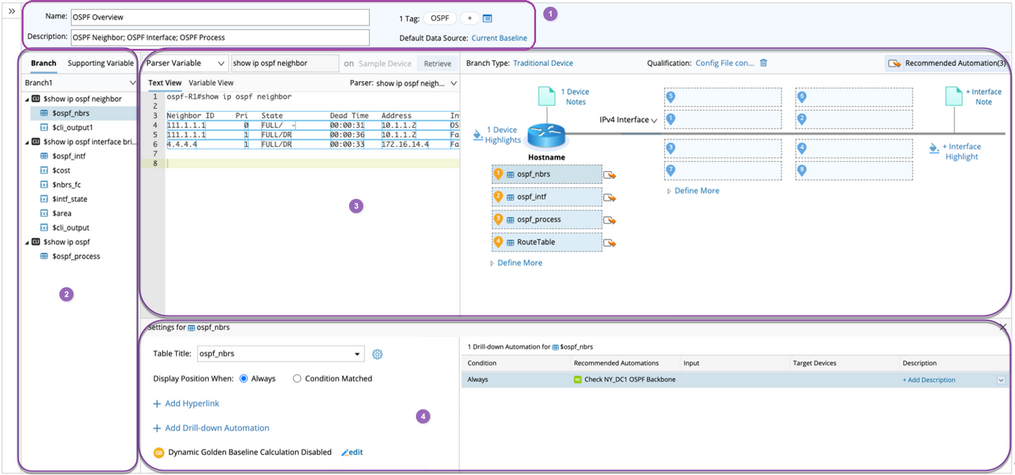 b.Add Drill-down Automation at the device/interface level. For example, add the automation Monitor CPU and MEM on the device position cli_output (filter).