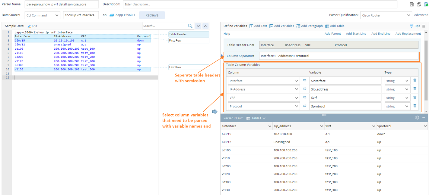 Table parser is used to parse table-formatted text, such as NDP table, VRF table, OSPF neighbors, etc. With table parser, users can address the line of table headers in the raw text, and then leverage column separator to manually adjust the column width of the table.
