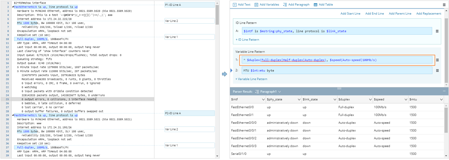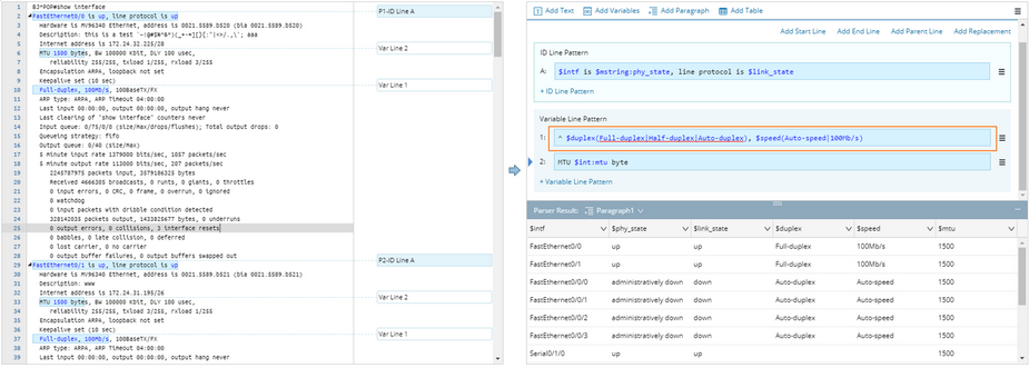 For example, to parse enumeration-type variables like $duplex and $speed, you can use “$duplex(Full-duplex|Half-duplex|Auto-duplex)” and “$speed(Auto-speed|100Mb/s)” in the variable line pattern.