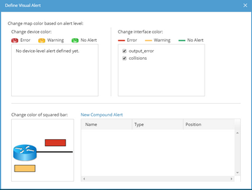 2)Specify which variable change will cause the device or interface color change. You can select multiple variables. 3)If you want to set complex conditions to involve multiple variables, you can click New Compound Alert to define Compound Alert. a)Specify the Compound Alert type between Device and Interface. b)Set conditions for variables. See Defining Alert for more details. c)Enter the alert messages and select the alert level. d)Click OK. 4)Repeat step 3) to add more Compound Alerts. 5)Click OK. 6)Select a position for compound alerts on a map. |