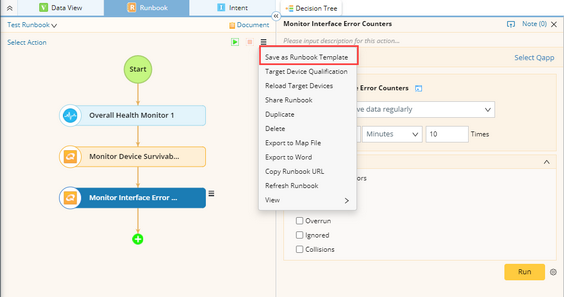 To share knowledge with junior users, you can save a golden runbook as a runbook template. When saving a runbook to a template, you can select which result to be saved. Only the selected action results of the action nodes will be saved to the template as the inputs. The target devices and execution results of these action nodes will be discarded.
