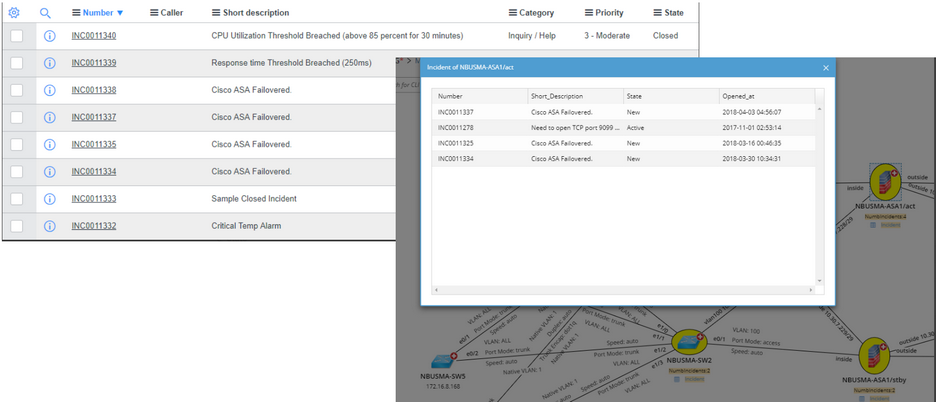 To help you understand the implementation flow of Single Pane of Glass, this section introduces a use case about ServiceNow Integration. In this case, the system retrieves the incident information for all devices included on a map from ServiceNow, highlight devices with incidents, and then display the detail incident tables on the map.