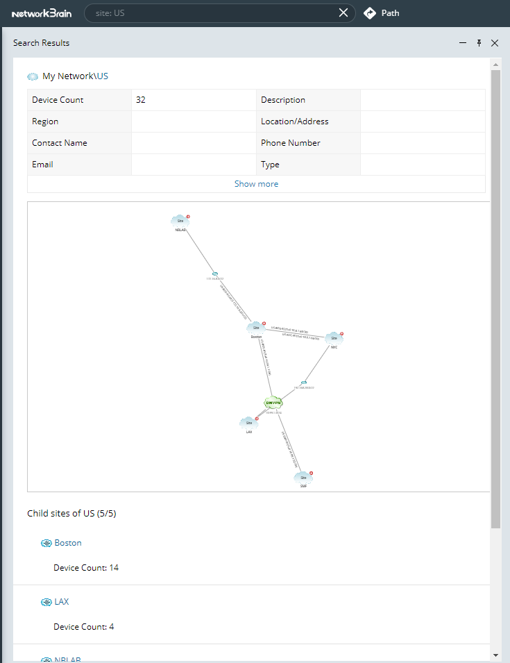 2.Press the Enter key on your keyboard to start searching. The corresponding site map is shown and all child sites or devices under the site are listed.
