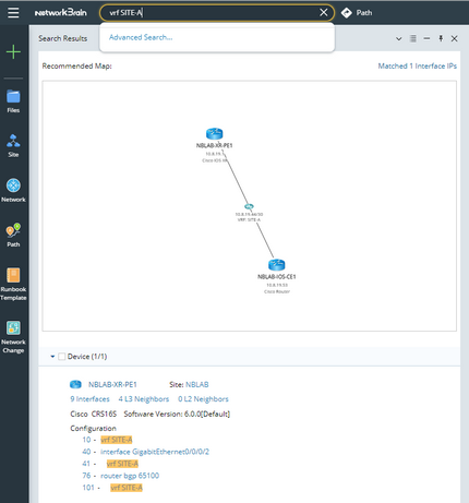 2.Press the Enter key on your keyboard to start searching. Devices and interfaces matching with the VRF are diagrammed and auto-linked on a preview map, including their neighbors.