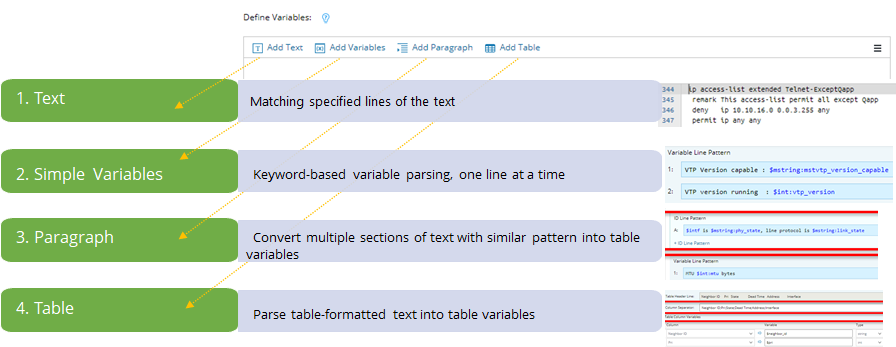 Paragraph parser can parse variables in recurring paragraphs, such as collisions and CRC errors for interfaces, etc., by anchoring paragraph identifier (ID) lines. See Define a Paragraph Parser for more details.