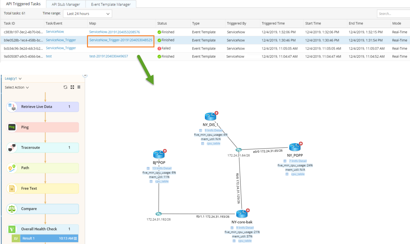 3.Click the map hyperlink of the triggered task to view the created map as well as the data collected by runbook (as long as you have added a runbook when defining the task).