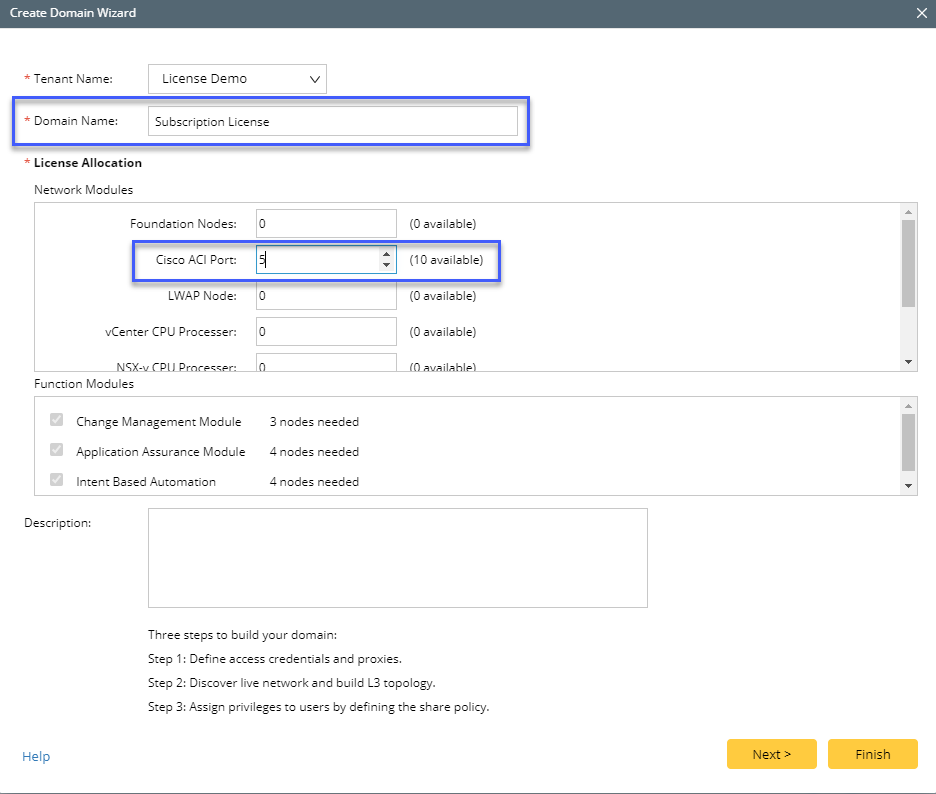 7.Specify a domain name and allocate the desired number of ACI ports to the domain.
