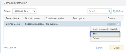 6.Select the existing tenant from the quick access toolbar, and select Edit from the drop-down list of the existing domain.