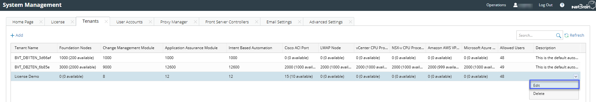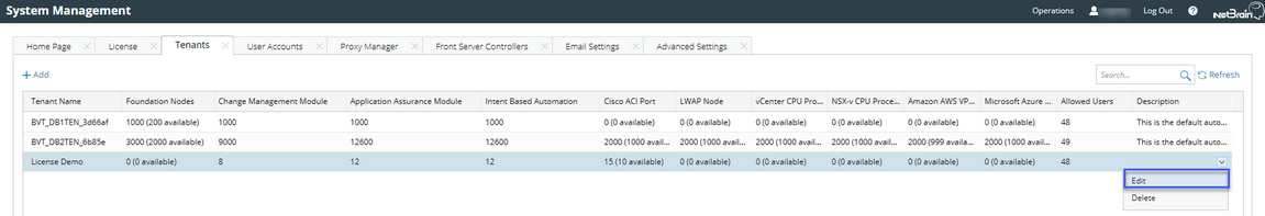 2.Select the Tenants tab, and select Edit from the drop-down list of the desired existing tenant.