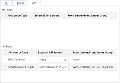 Used to specify the API server to retrieve device data from an external API server. Note: The external API servers must be predefined in the API Server Manager. If a Front Server is specified when defining the API server, the system will use the specified Front Server to access the external API server. See Adding an API Server for more details. Note: The Cisco ACI or VMware ESXi source types in the TechSpec area are only available for the devices in Cisco ACI or VMware ESXi networks, and their external API servers cannot be manually specified. |