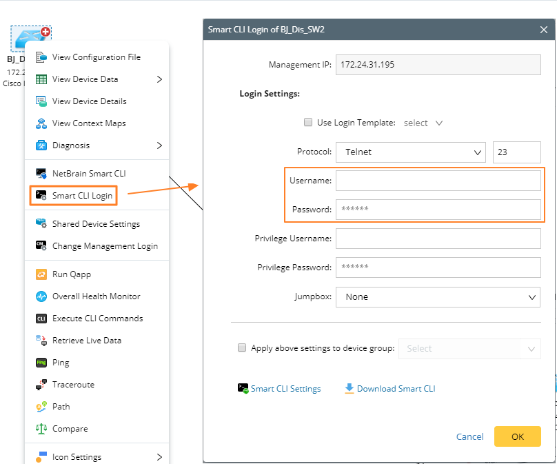 - Specify the jumpbox for Smart CLI if your network has configured jumpboxs for the live access. To set the jumpbox, right-click the target device on a map, select Shared Device Settings and select a jumpbox in the Jumpbox for CLI field.