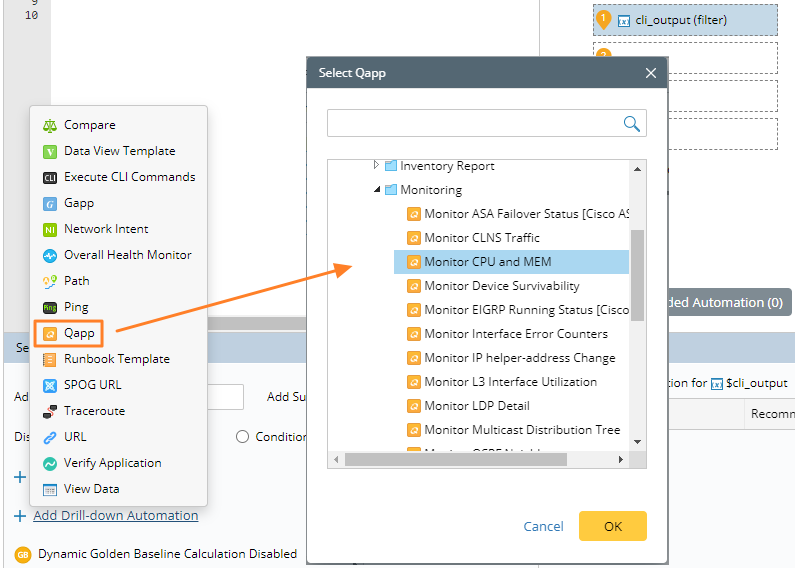 b.Add Drill-down Automation at the device/interface level. For example, add the automation Monitor CPU and MEM on the device position cli_output (filter).