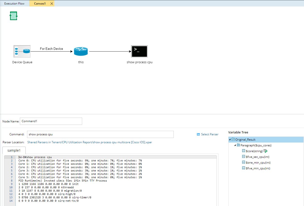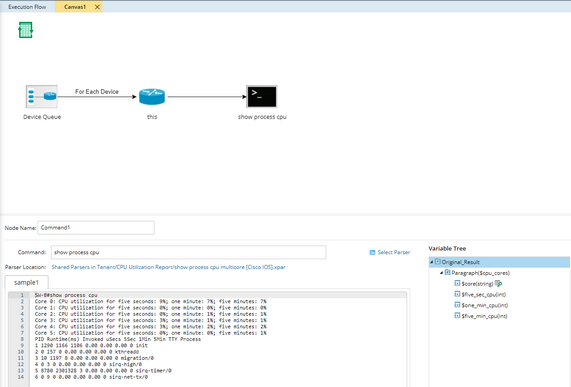 2.Enter show process cpu in the Command field and select show process cpu (Cisco IOS Switch, Cisco Router) from the drop-down list. The variables related to this command are auto-loaded in the Variable Tree pane. You can alternatively click Select Parser and select a parser from the Parser Library directly.