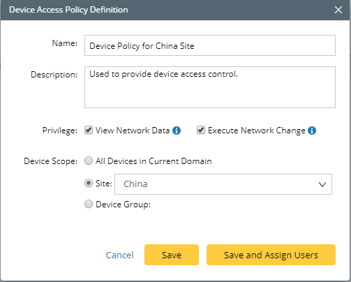 Tip: You can also assign users on the Share Policy tab, or apply the policy to users when adding users in the System Management page. If a defined policy hasn't been assigned to any user, all users do not have the two privileges: View Network Data and Execute Network Change.