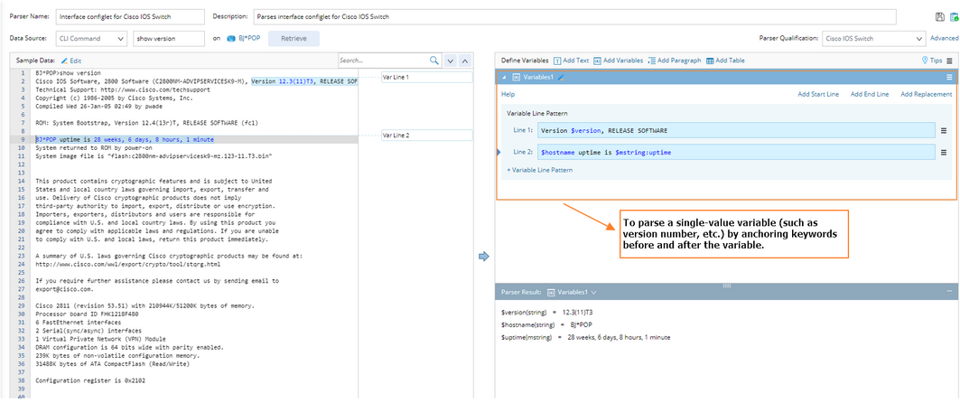 Tip: The system uses the two words before and after 12.3(11)T3 as keywords to automatically generate the line pattern Version $version, RELEASE, using the notional word closest to the variable as the variable name (version in this example). If the word before or after the variable is “is”, “was”, “on”, “of”, “with”, “at”, “under”, “for”, “in”, or “:”, the system will look for one word further.