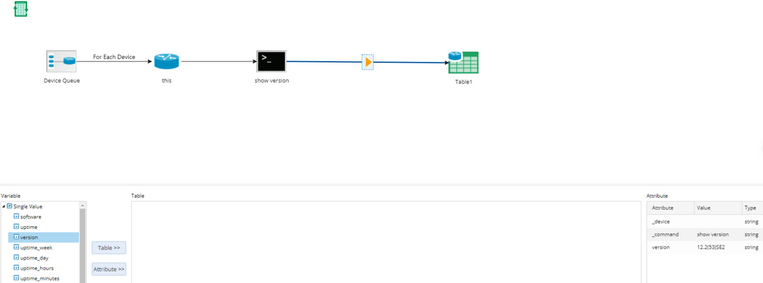 Tip: NetBrain parsers show the parsed data in two forms: Single Value and Table. For variables in the Single Value form, you can export them to a Table node as row data by clicking Table>> or as table attributes by clicking Attribute>>. However, for variables (mostly interface-level variables) in the Table form, you can only add them to a Table node as row data by clicking Table>>.