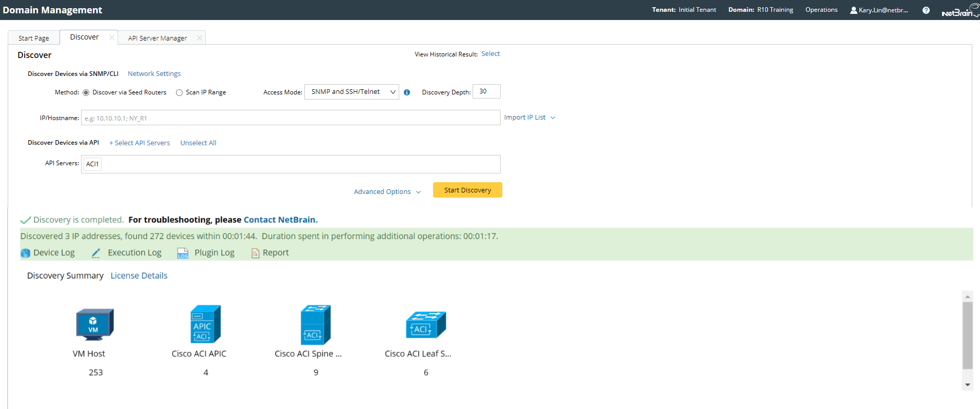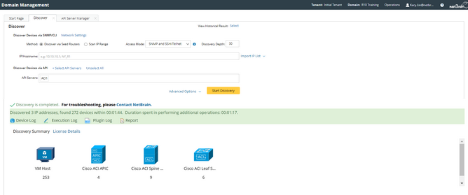 Note: The SDN discovery only retrieves basic data of your network and builds L3 topology. After the discovery, you need to execute a benchmark task to retrieve all data and build all components, including visual spaces and data views. See Auto-Updating ACI Data in NetBrain through Benchmark for details.