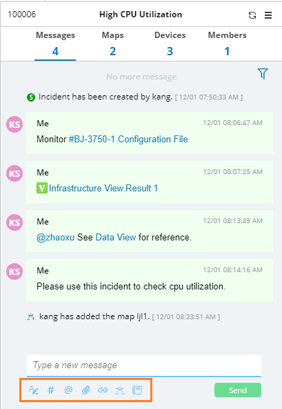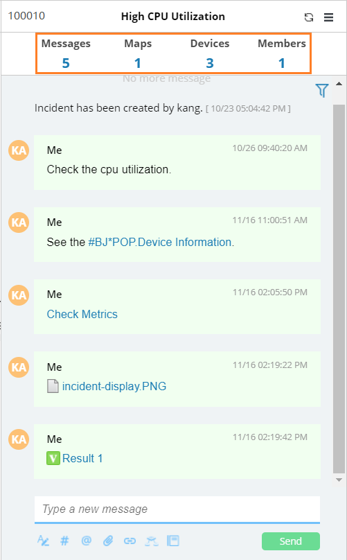 The collaboration session of an incident allows you to post messages for any findings, add relevant maps and devices, invite more colleagues to join the incident.
