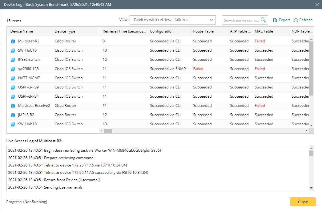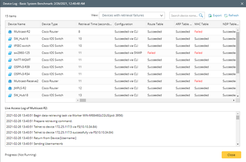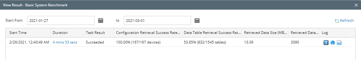 4.In the following dialog, the Configuration Retrieval Success Rate reflects how many devices are qualified and can be retrieved data successfully during the task. Select the log type to view in the Log column.