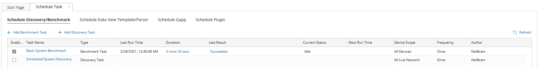 Tip: You can view the latest execution result of all benchmark tasks from the Last Result column. To view the detailed latest execution log of a benchmark task, click the hyperlink (such as Succeeded) in its Last Result column.
