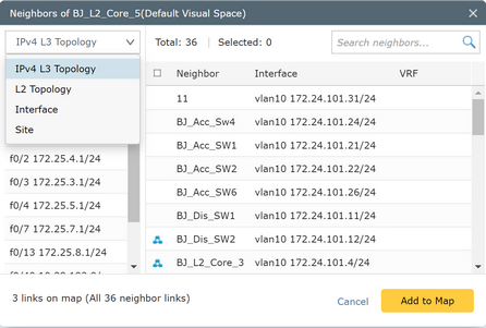 3)Select one or multiple neighbor devices or sites, and then click Add to Map. You can also double-click All Neighbors to add all the listed neighbor devices to the map.