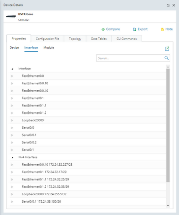 Both built-in and customized interface properties for different topology types are stored in the Global Data Repository. You can browse, modify, and export the values of interface properties for each device from the Device Details pane.