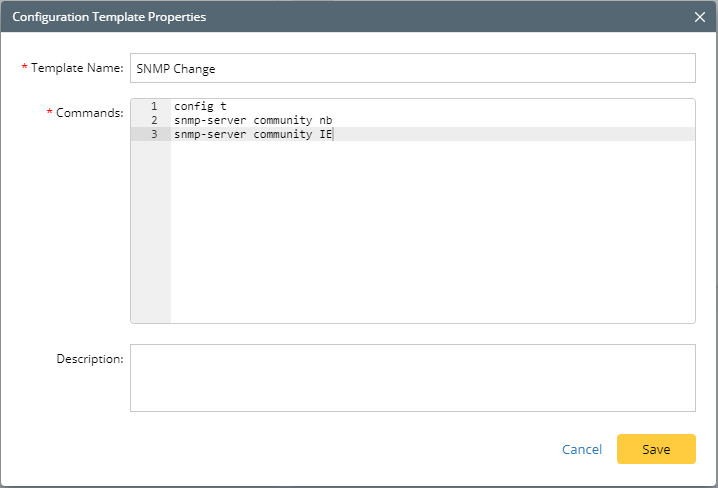 4.In the Configuration Template Properties dialog, enter the template name and commands.