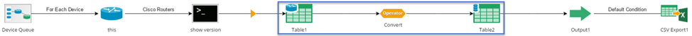 Tip: The attribute table pane on the right displays the built-in system attributes as long as you retrieve the live data via CLI in the Command node. When you convert the table to a Global Data Table by using the Convert Operator, the table attribute $_device will be added as a new column in the Global Data Table.