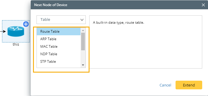 oSystem Data Table — built-in data types (including Route Table, ARP Table, MAC Table, NDP Table, STP Table, NCT Table), and only can be extended from a Command node. See Configuring system data table for more reference.