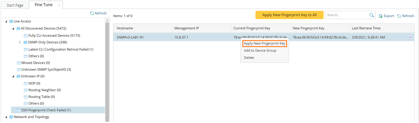 3.On the Fine Tune tab, select SSH Fingerprint Check Failed in the left pane and all devices with SSH fingerprint check failed are listed.