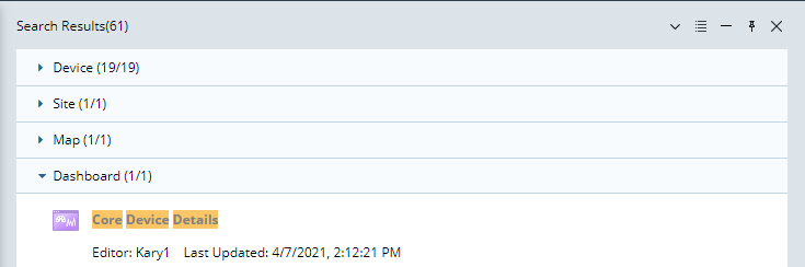 2.Press the Enter key on your keyboard to start searching. The search results are displayed under the Dashboard group with the matched keyword highlighted.