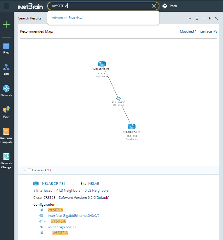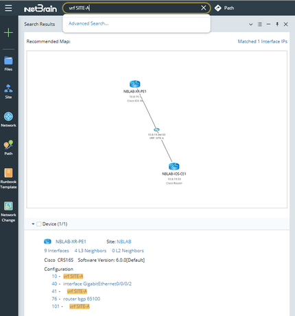 2.Press the Enter key on your keyboard to start searching. Devices and interfaces matching with the VRF are diagrammed and auto-linked on a preview map, including their neighbors.