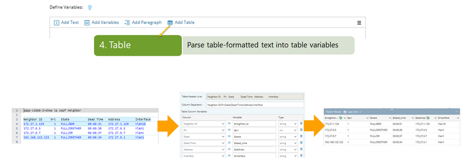 Table parser can parse table-formatted text, such as NDP table, VRF table, etc. See Define a Table Parser for more details.