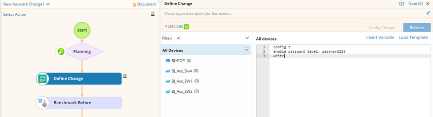 When you define commands in a Change node, the commands may contain some sensitive data, such as passwords and values. You can use variables in commands to protect sensitive data, and only users with specific privileges can view the data.