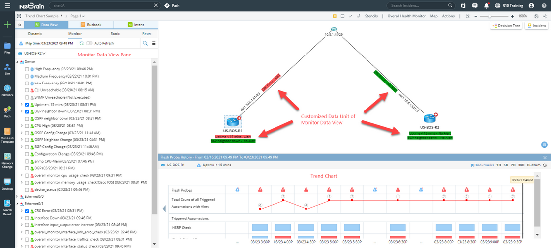 •Monitoring Data View – A special Data View demonstrating the results of Flash Probe and the Monitoring Variable defined in the Adaptive Monitor. You can customize the visual appearance of these results for each device in the dynamic map.