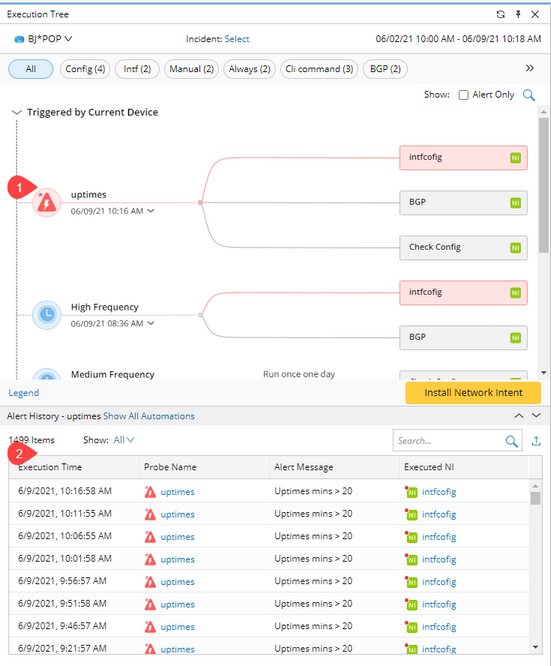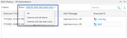 Note: The alerts generated by probes and network intents are sorted by the Execution Time.