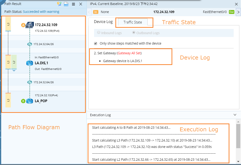 Click a device icon in the path flow diagram to browse the log of the device under the Device Log tab. Or click the icon or the icon to browse the device logs in order.