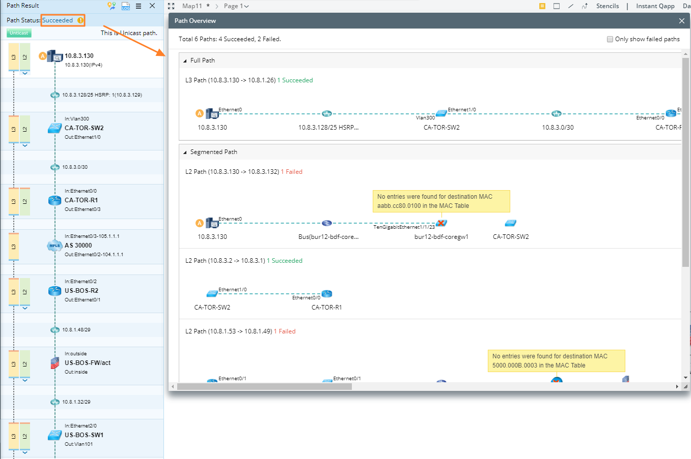 : L3 paths are calculated successfully but L2 paths are calculated unsuccessfully.