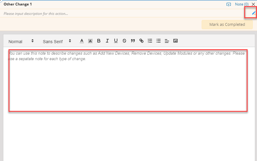The Other Change node provides note function to remind the change executor to do some operations, such as discovering new devices to the domain, removing devices from the domain and updating modules beyond the change management task.