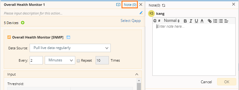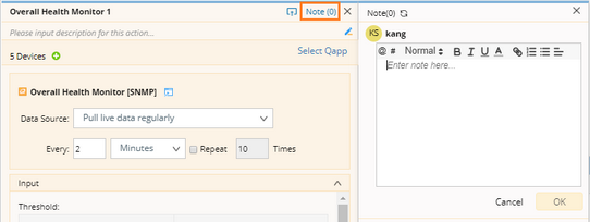 1.Select an action node in a runbook, and click the Note hyperlink to expand the Note pane.