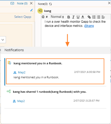 In the Note pane of a runbook, you can use the mention function to alert users or to call a device or a map.