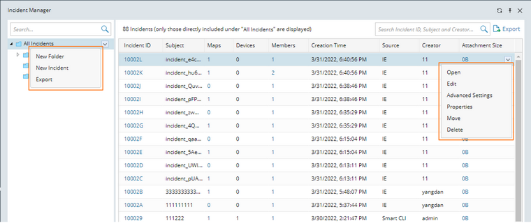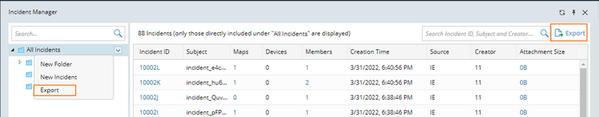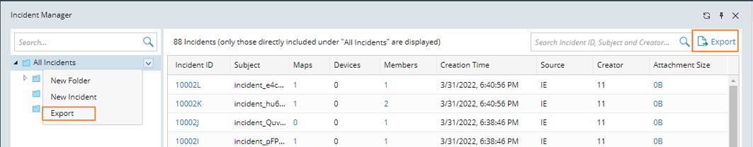 Note: The export function in the folder structure can be used to export the incident list under the current folder and its subfolders, but the export function at the upper-right corner of the incident table can only export the incident list in the current table.