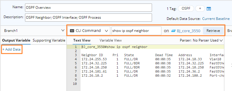 a.Add Output Variable. Click Add Data and select CLI Command, then enter a command for the selected device to retrieve corresponding data.