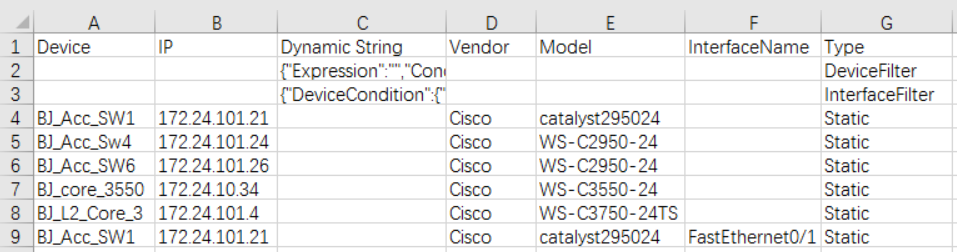 1)Click Import. 2)Select a .csv file with the required device information from your local folder. Here is a sample of the .csv file contained devices and interface: 3)Click Open. |