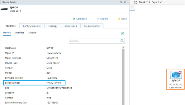12. Save and run the Qapp on a map with Cisco IOS switches included. Once the Qapp execution is finished, double-click a device to view whether the Serial Number field is populated in the Device Details pane.